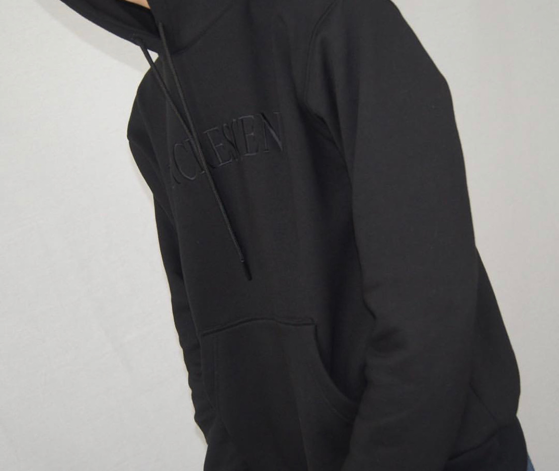 Obsidian Black, recycled cotton hoodie that features a tonal black embroidery along the front of the garment.